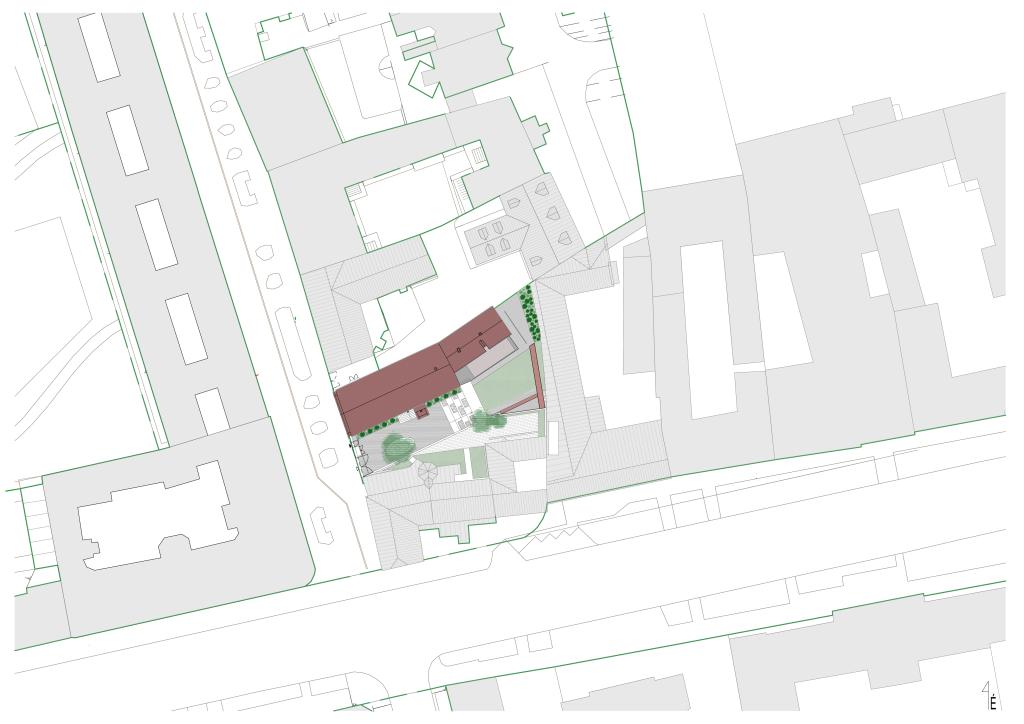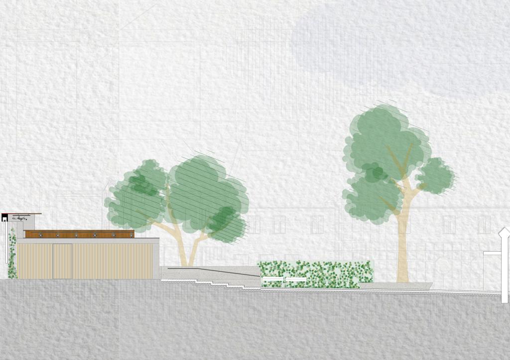 Az udvar kialakítása és használati módja a 2019-ben született koncepció tovább gondolásából táplálkozik, kiegészülve a használók néhány specifikus igényével. Feltételeztük, hogy a nézők a füves területen foglalnak helyet és a keleti tűzfal irányába néznek. A tűzfal előtt vagy a füves területen, vagy mobil színpadon játszanak az előadók. Számos esetben a szűk és rossz állagú teraszt használták színpadként, hátterében a „gazdasági” épület homlokzatával. A tervezési feladat az volt, hogy a jelenlegi terasz helyén egy jóval alkalmasabb előadóteret hozzunk létre és közben tegyük alkalmassá a tűzfal előtti teret is az eredetileg elgondolt hasznosításra. Nem egyszerű feladat, hiszen itt már a nézők és előadók helyzetén kívül a világításról, a hangosításról is gondoskodni kell, ráadásul több irányból. Ezek a technikai elemek alapvetőleg nagy méretű traverzek tervezését követelnék, melyek előnytelenül hatnának ebben a kis méretű, kompakt közösségi térben. Az épület előtt a betonelemekből készített teraszt elbontjuk és helyére nagyobb méretű, színpadként használható teraszt építünk. Felülete nyersbeton, de a játéktér helye faburkolat. Az udvar keleti-magasabb részében egy ék alakú sűrű talajtakaró van. Ez a terület alkalmasnak bizonyult arra, hogy egy melléképületet helyezzünk el, úgy hogy az épület lehetőség szerint a kívánt helyiségfunkciókon túl ellássa a traverz szerepét. Kézenfekvő volt az is, hogy az épülettel együtt gondolva alakítsuk ki a kertmozi számára telepítendő vetítővászon tartószerkezetét, mely szintén traverzként is működik. Az udvar kialakításánál nem volt elvárás az akadálymentesítés, viszont a melléképület igyekszik megoldani ezt a problémát, továbbá az előadásokhoz tartozó kerti bútorok tárolására is alkalmas.