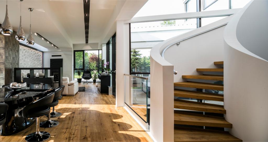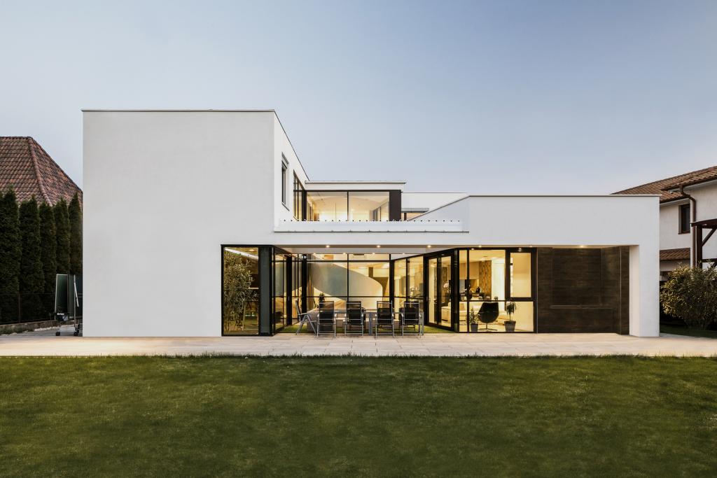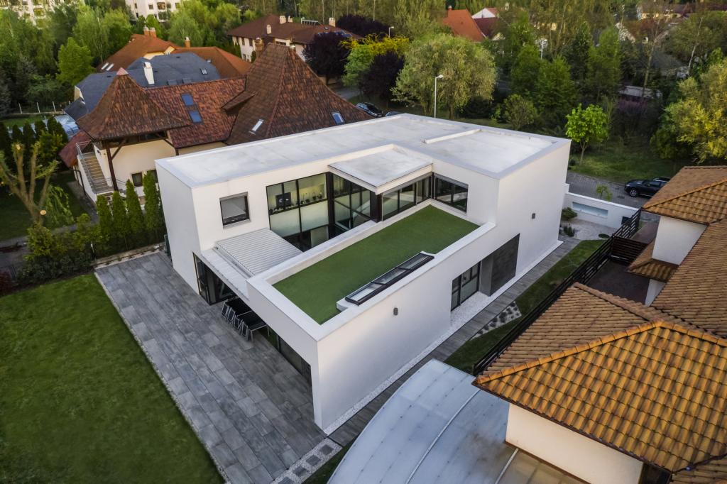 A ház, mely alkalmas két (alkalmanként három) generáció lakó, pihenő, szabadidős, munka, együtt élő, vagy éppen elkülönülő igényét szolgálni. A telek és környezet adottságainak figyelembevételével egy pince+földszint+1 emelet szintekből álló, letisztult vonalú, lapostetős épület született, mely találkozott a megrendelői ízléssel és igénnyel is. Noha a szabályozás a területet kisvárosias zónaként tartja számon, mégis karakterében, szövetében, és hangulatában kertvárosi miliő szövi át. A városépítészeti szempontból fiatal telekosztások tekintetében nincsen tradicionálisan fejlődő beépítés és utcakép, a múlt és a jelen tekintetében egymásra épülő építészeti rétegek - az épületek mind a közelmúlt (10-15 év) produktumai. Ennek megfelelően a környező épületek - megfelelő „gyökér” hiányában - az építészeti gondolkodás és „stílus” széles palettáján mozognak. Az építési telkek a forgalmasabb, szintén Károli Gáspár utcaként nevezett kiszolgáló útról zsák-hurokként nyílnak, melynek következtében ezek a területek csendesebbek, intimebbek - erősítve ezzel a kertvárosi hangulatot. A területet keletről a Tócó csatorna szegélyezi észak-déli folyásiránnyal, északról a Vezér utca városból nyugati irányban kivezető szakasza, mely mentén az építési telkek vonalában intenzív fásításra nyílik lehetőség. A tervezéssel érintett telek az előbb felsorolt adottságok részeként az utca kanyarulatában helyezkedik el. Emiatt az utca felé ék alakban megformált terület nyílik az intimebb telekhátsó irányába, tengelye észak-déli irányú. A szomszédos épületek földszint+tetőtér, illetve földszint+emelet szintekből álló, magastetős épületek. Az épület stilizált modellje két szögbe állított tömeg, mely az utcafronton összetömörödik, esszenciálódik és egymásba olvad. Így az utcával kommunikáló tömege azon kívül, hogy a megközelítést tartalmazza, csak a szükséges mértékben ad feltárulkozást. A hátsókert felé viszont megnyílik, üvegfelületeivel erre tájolódik, mindezt úgy, hogy a környezet számára nem enged betekintést. Erre tájolódnak a nappali elfoglaltság funkciói, a wellness és terasz. A két tömeget az épület súlypontjában a lépcsőház köti össze, mely meghatározó vertikális elemként, áttört spirál tömegével szabadon fut három szinten keresztül. A belső karéjban átforduló üvegfelületek miatt az épület a használók számára átlátható, folyamatos vizuális kapcsolat jellemzi, melyet az üveg sajátossága miatti a reflexió is színesít. Tömegformálása egyenes következménye az alaprajzi szervezésnek és fordítva.