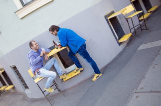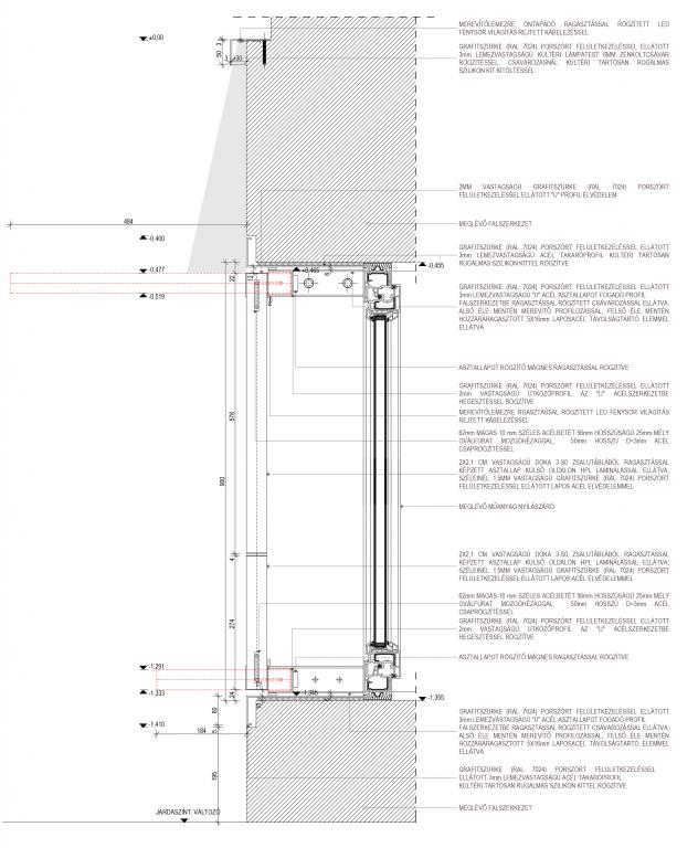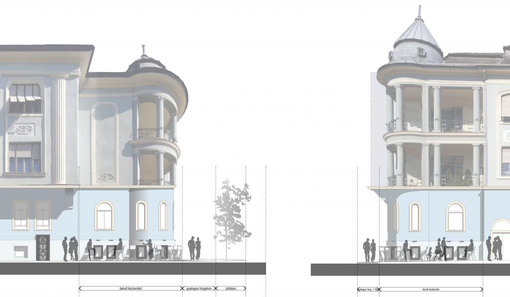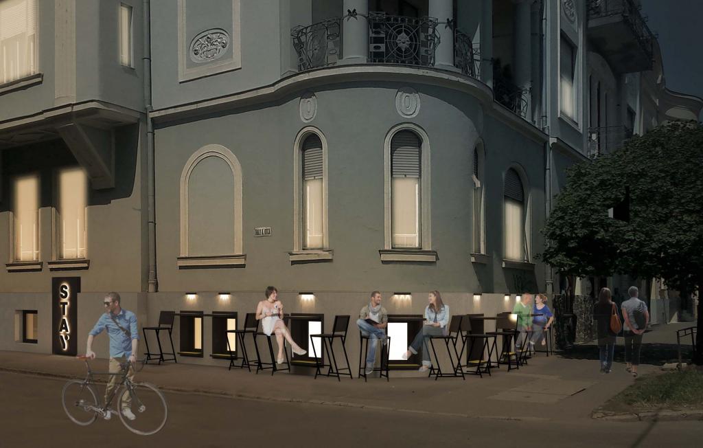 A STAY BÁR a Péterfia és Thaly Kálmán utcák kereszteződésében, pince+földszint+ 2 emelet szintekből álló saroképület pinceszintjén működik. A vendéglátás helyszínét kívántuk kiterjeszteni fogyasztóterasz formájában. A fogyasztóterasz kialakításának erős korlátja a Thaly Kálmán utca szűk gyalogos járdája, mely alig-alig visel el további szűkítést. A jelentős gyalogos és kerékpáros forgalom miatt a Péterfia utca szélesebb járdakeresztmetszete is érzékenyen reagál az itt elhelyezett fogyasztóteraszok méretére. Az épület homlokzata enyhén ki-be lépcsőzve követi a járdát, míg a sarkon ívesen fordul át. Az említett helyszűke miatt a fogyasztóterasz kialakítását a pinceablakok speciális spalettáival oldottuk meg. A spaletták középen felnyíló, aszimmetrikus kialakítású szerkezetek, melyek felnyitás után rögzítve adják a fogyasztópultot és alsó részük a lábtartót. Így zárt állapotban vagyonvédelmi célt szolgálnak, nyitott állapotban pedig fogyasztóhellyé alakulnak. Ezzel elérhető, hogy minimális helyszükséglet mellett létrejöhessen a min.: 1,50 m gyalogos közlekedési zóna. A kb. 50 cm kilógású pultok homlokzat mellett elhelyezett magasított székekkel működnek. A székek a bár belsőépítészetében használt egyedi tervezésű bútorok. A pultok megvilágítását egyedileg tervezett világítótestek végzik, melyek a lábazat peremére erősítendők fel. További megvilágítást ad a köztéri lámpák, illetve az ablakkeretezés rejtett led világítása. A bár bejáratának ajtaján a STAY felirat szintén rejtett világítást kap, mely a plasztikus betűk síkból való kimozgatásával értünk el.