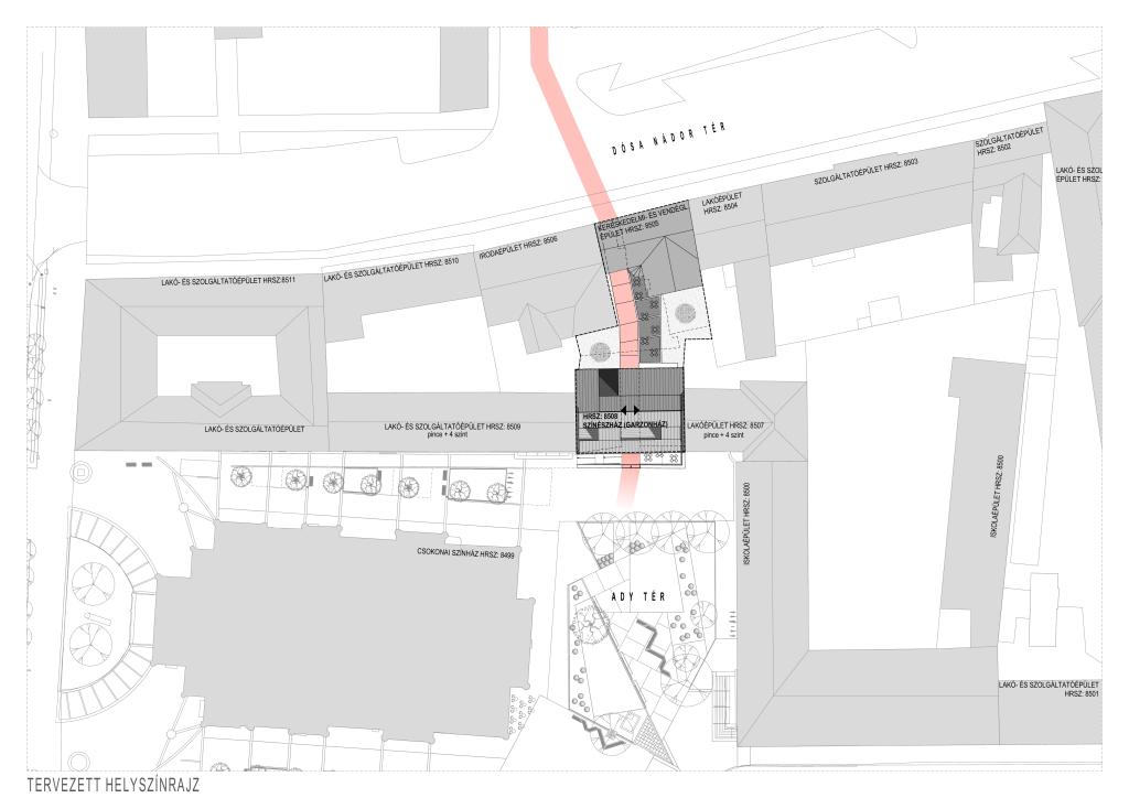 A Színészház 1965-66-ban épült Schmidt Tibor tervei alapján. A garzonház alapvető feladata és létrejöttének célja a Csokonai Színház színészeinek, illetve vendégművészeinek elszállásolása. A Színészház az Ady park és a Csokonai Színházat körülölelő térfal-együttes meghatározó eleme. A homlokzati síkban zártsorúan csatlakozó szomszédos épületek nyílásokkal perforált tömegei között a Színészház végigfutó loggiáival és homlokzati síkban tartott mellvédjeivel - a „felhasítások” által - egy markáns, mozgalmas és ezzel együtt visszafogott kapcsolatot teremt. A tömbbelsőbe az épület hátsó homlokzati kommunikációját a Dósa Nádor tér 3. alatti épület jelenlegi használata korlátozza. A Dósa Nádor tér irányából megnyitott romkocsma belső udvari vertikális és horizontális, kissé artikulálatlan lehatárolása egyrészt a Színészház telekbelső felé történő kommunikációját gátolja, másrészt a hátsó fal előtti térképzést teszi levegőtlenné, az itt méltatlan épületszerkezetek (szendvicspanel-fal) használatával. A telekbelsőbe néző garzonok számára így marad a környező épületek tetősíkjainak játéka, innen hiányzik a tér. Az épületet tartalmazó tömb a város két frekventált és meghatározó tere, a Dósa Nádor tér és az Ady park közé ékelődik. Az épület elhelyezkedéséből adódóan alkalmas lehet arra, hogy egy új térkapcsolatot biztosítson a jelenleg egymástól elkülönülő két forgalmas tér között. A Színház és a Színészház felújítása lehetőséget teremt egyes városszerkezeti rendszerek átgondolására, újraértelmezésére. Ahogy a Színház főhomlokzata előtti tér az új helyzet folytán újraértelmeződik, reagál a változásokra, úgy a Színészház épülete is túlmutathat a puszta felújításon, korszerűsítésen. Itt ugyanis lehetőség nyílik a Piac utca sétáló forgalmát keresztező gyalogos tengely kiterjesztésére. Jelenleg a Hal köz - Simonffy utca - Piac utca - Rózsa utca által kijelölt vektor a Dósa Nádor tér határán reked meg. A Dósa Nádor tér újragondolása már előre vetíti azt a törekvést, miszerint a jórészt vendéglátóhelyeket és ezzel együtt köztéri teraszokat sorakoztató útvonal terjeszkedni kíván. A Színészház pozíciója ilyen értelemben is jelentősnek mondható, hiszen rajta (és a Romkerten) keresztül az Ady park könnyedén kapcsolódhat erre a tengelyre. A Színészház tömbbelsőbe néző nyílászárói a jelenlegi előírások szerint lehetetlenné teszik az épület átalakítását, illetve bővítését. Szükséges tehát, hogy a Színészház és a Dósa Nádor tér 3. alatt működő Romkert telkének összevonása. Ezzel együtt lehetőség nyílik egyrészt a Színészház tervezett átalakításaira, másrészt szabad utat enged a Hal-köz - Ady park tengely létrejöttének. A Dósa Nádor tér 3. szám alatti Romkert belső udvarának rendezése mindenképpen megoldandó feladat, így létrejöhet az épületek között egy szellős tér és a sétány mentén továbbra is lehetőség nyílik külső vendéglátó teraszok kialakítására. A Dósa Nádor tér felöli kapuzat az idők folyamán leszűkült, egy része beépült. Ezt meglévő adottságnak tekintjük, hiszen a kívánt gyalogos forgalom átbocsájtását így is tudja biztosítani. A Színészház 1966-os megépülte óta nem esett át jelentősebb felújításon. Általános állapota mellett funkcionális kialakítása is idejét múlt. A földszint egy traktusában jönne létre az épület gyalogos forgalom számára kialakított átjárója. Ennek eredményeképpen az átvágás egyik oldalán a Színészház bejárata jön létre irodákkal, kiszolgáló helyiségekkel, lépcsőházzal és lifttel a földszinten. A passzázs másik oldalán egy önálló megközelítésű és működésű kávézó alakul ki. Az emeleti szinteken, a nyugati oldali garzonok 3-as csoportjából 2 komfortos és jelentősen tágabb egység alakul ki. A keleti, Ady parkra néző garzonok alapterületük megtartása mellett jelentős felújítással és korszerűsítéssel válnak lakhatóbbá és a vonatkozó követelményeknek megfelelővé. A tervezett lakóegységek kivétel nélkül rendelkeznek minden olyan komforttal, melyekkel önállóan működhetnek: lakótér, fürdő, konyha. A földszinten és emeleten megszűnő funkciók szintenként egy helyiségben (személyzeti pihenő, iroda, raktár, mosoda), illetve a beépített tetőtérben kerülnek pótlásra. A tetőtérben alakul ki két nagyobb méretű lakóegység, valamint egy pihenésre szolgáló wellness, kondicionáló funkciócsoportból álló közösségi helyiségegység.